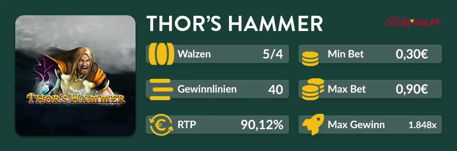 Thor’s Hammer bringt die Macht der nordischen Mythologie direkt auf die Walzen. Im Mittelpunkt steht der Donnergott Thor mit seinem legendären Hammer Mjölnir. Der Slot überzeugt durch eine düstere Atmosphäre, klare Symbolik und klassische Mechaniken, die für ein dynamisches Spielerlebnis sorgen.
